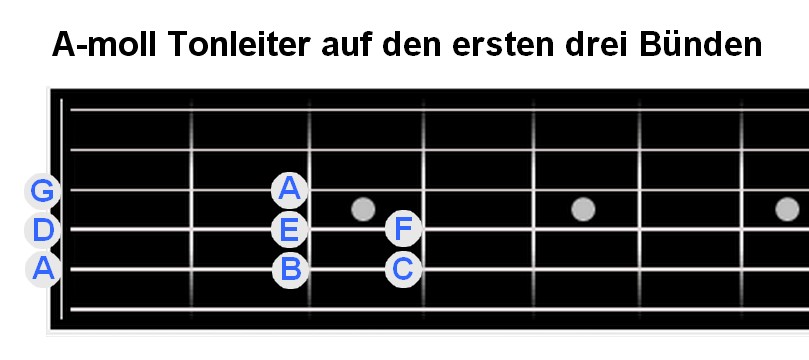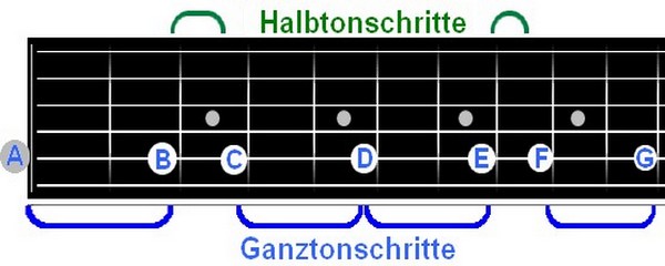 Die Töne auf der Gitarre sind nicht so leicht zu finden. Aber es ist trotzdem keine Hexerei. Der Abstand von einem Bund zum nächsten ist immer genau einen Halbton groß. Will man also einen Ganztonschritt weitergehen, muss man zwei Bünde weiterzählen, bei Halbtonschritten einen Bund. Beginne bei der leeren A-Seite und spiele A B C D E F G (A).
